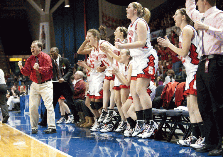 Scarborough coach Jim Seavey and the Red Storm bench react to a bucket in the final minutes of Saturday’s Class A State Championship against Skowhegan. The Red Storm defeated Skowhegan with a 52-32 final to capture the girls Class A basketball state title. (Staff photo by Brandon McKenney)