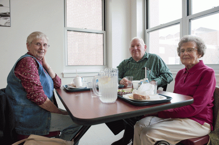 Priscilla Schwartz, left, Dick Banks and Marilyn Sherrard eat lunch at Cape Elizabeth High School last week. Cape Elizabeth senior citizens are invited to the school each month to participate in the school’s Chef of the Month program, in which area chefs cook a tasty, wholesome meal for students and also local seniors who want to dine with the younger generation.