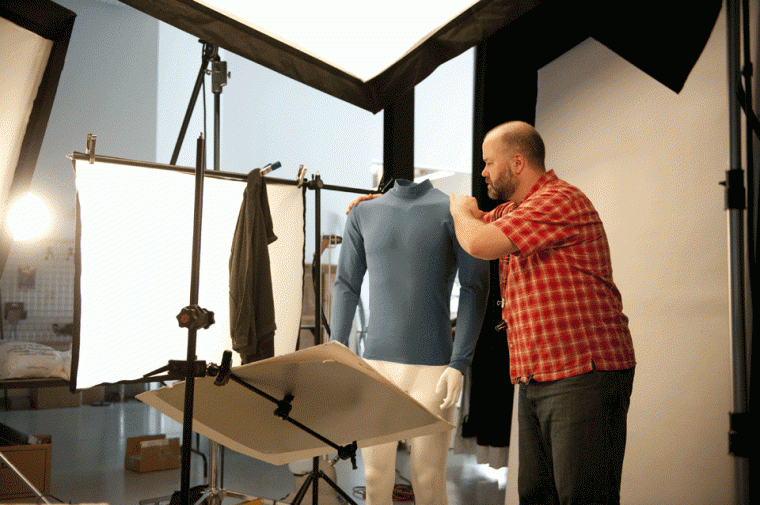 Tom Canney, a photo stylist with Quad Graphics Photography Services, works with an L.L. Bean shirt at the company’s new studio in Westbrook last week. (Staff photo by Brandon McKenney)