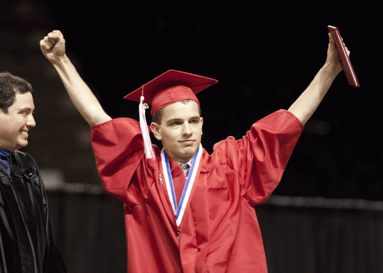 Niels Doughty raises his arms in celebration after receiving his diploma at the Scarborough High School graduation held Sunday at the Cumberland County Civic Center. (Photo by Rich Obrey)