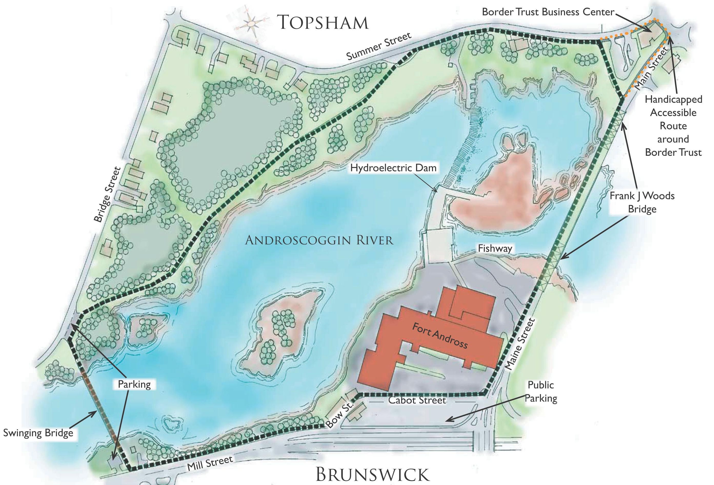 A concept map shows the proposed 1.25-mile Androscoggin Riverwalk between Brunswick and Topsham. The Androscoggin Brunwick-Topsham Riverwalk committee hopes to raise $1.2 million for the project, $500,000 of which from fundraising. The other $700,000 will come from grants.