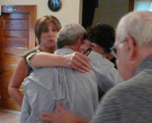 Paul White, with back to camera, receives a hug from a supporter at a meeting of the Eliot Board of Selectmen last week. The town fired White for violating several shoreland zoning codes at his home in Raymond. (Staff photo by John Balentine)