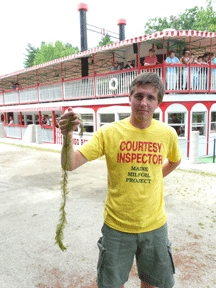 Courtesy boat inspector Christian Oren displays a piece of milfoil. Oren has been part of a multi-year milfoil eradication effort that has virtually cleared the invasive weed from the Upper Songo and Brandy Pond. (Staff photo by John Balentine)