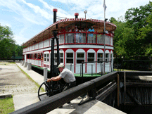 Lock operator Sam Chute, above, turns a mechanism that opens the lower end of the Songo Lock in Casco so the Songo River Queen can exit into the Lower Songo River last Friday afternoon, the day after the Bridgton-based Lakes Environmental Association called for the state to close the historic lock due to milfoil infestation concerns. (Staff photo by John Balentine)