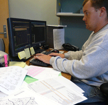 Matt Magill, a shift supervisor at the Cumberland County Regional Communications Center in South Windham, has been spending the last few weeks inputting Windham’s emergency response plans into the county’s computer system in anticipation of the Aug. 16 switchover. (Staff photo by John Balentine)