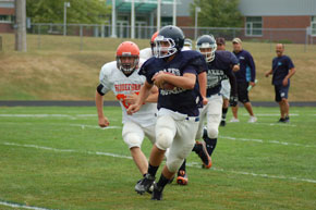 Fans expecting to see a normal, “unofficial” game were likely disappointed, although that didn’t stop a healthy number of Blazes fans from turning out. True to the teaching-oriented nature of the scrimmage, Monday’s action was a somewhat-disjointed succession of 10-play offensive series run by Biddeford and Westbrook, with each team starting on the opposing 20-yard line and attempting to push down the field, regardless of downs or turnovers. Coaches stalked the wet turf, pointing out flaws, ordering adjustments, and making a quick succession of substitutions. The Tigers got into the end zone twice, leaving several Westbrook seniors frustrated and anxious for improvement.