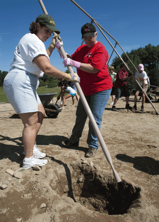 Tracy Littlefield and Irene LeClaire were two of the many volunteers helping to build Kelli’s Playground in Windham on Saturday, helping here to guide the support poles of the new swing set into an anchor hole. (Photo by Rich Obrey)