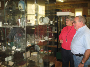 Westbrook Historical Society members Donna Conley, left, and Mike Sanphy look over the contents of a display case containing items of local significance.Staff photo by Joey Cresta