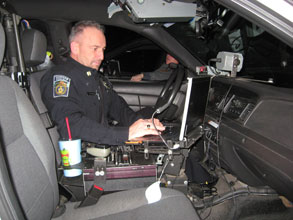 Gorham police Officer Ted Hatch works on a computer in his cruiser. Between the two front seats, Hatch keeps an assault rifle and a 12-gauge shotgun. Staff photo by Robert Lowell