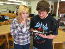 Cody Whitten, a senior at Bonny Eagle High School and fellow senior Barbie Whitten (no relation), check out the library’s Amazon Kindle, which librarian Jodi Breau has recently circulated for student use. Cody has read “Eragon” by Christopher Paolini on the Kindle, and although he enjoys traditional books, he likes the features the Kindle offers. “I like my regular books,” he said, “but I don’t mind reading on either the Kindle or a regular book. I guess it’s equal, but the Kindle is more portable.” (Staff photo by John Balentine)