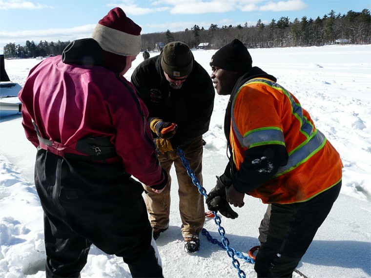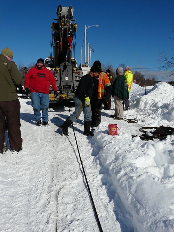 Dick Stewart, center, and others work to prepare the winch to tow the pickup truck to shore.
