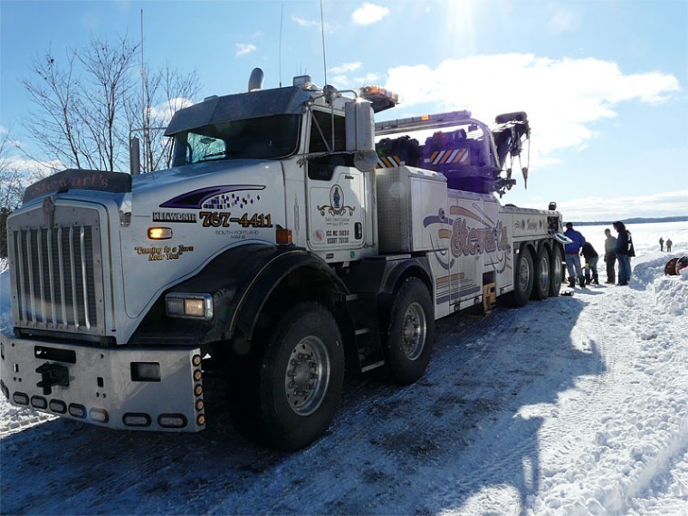 Heavy Hauling is the name of the game where you’re trying to dislodge a 16,000-pound pick up truck loaded down with thousands of pounds of water and entombed in six feet of slushy ice.