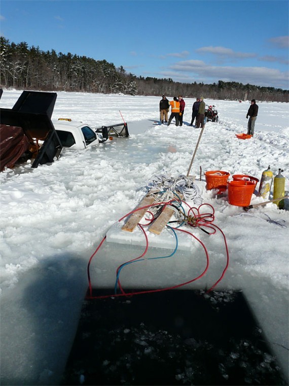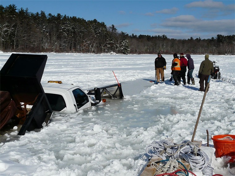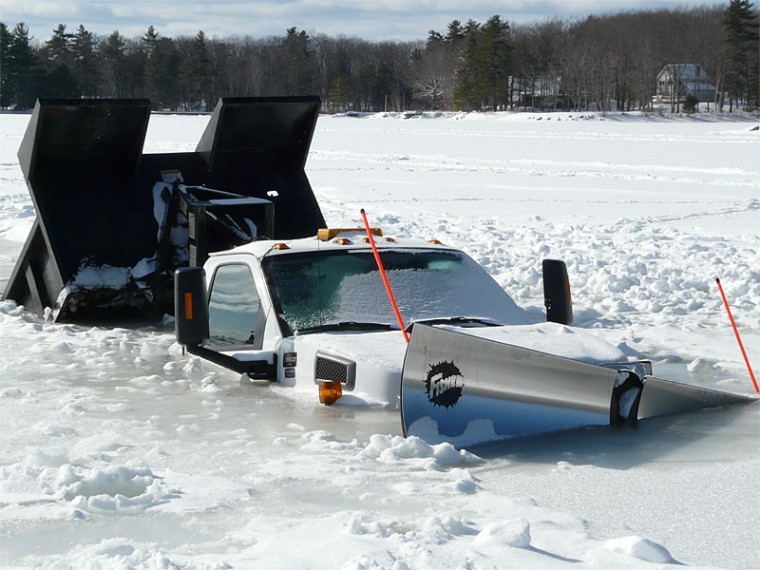 Mike Manning of MGM Builders in Windham was doing a good deed (plowing a way so ice fishermen could access their shacks) when his heavy truck fell through the ice on Jordan Bay. Manning was driving back through a section he had already plowed when the truck cracked through the ice.