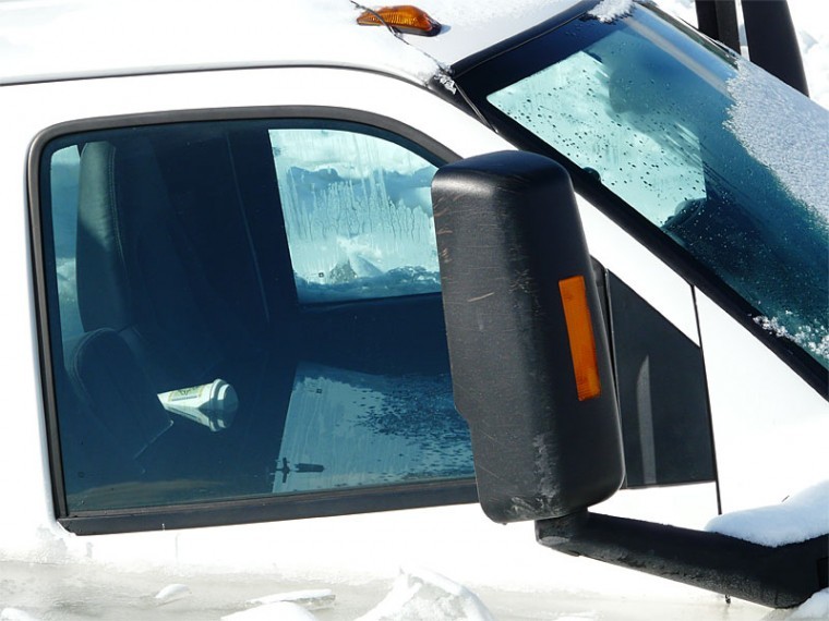 Lake water fills the cab of the pick-up truck. A coffee cup floats.