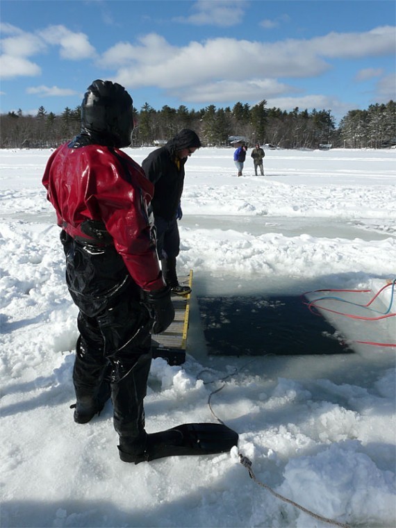 Jim Buxton a diver for SeaTow, which is based in Portland, arises from the cold water after affixing lift bags to the bottom of the truck.