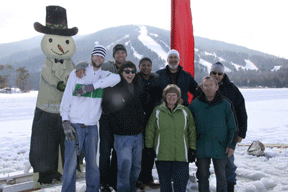 The fourth annual Ice Out contest is officially under way now that the Bridgton Community Center’s snowman is on the ice at Moose Pond. Pictured with Frosty on Saturday, Jan. 29, are Shane Keenan, Brett Smith, Jacob Grills, Parrish Rogers-Reed, Bridgton Academy Headmaster Grady Vigneau, BCC directors Mike Tarantino and Merry Vigue, and Ice Out designer Fred Hammerle. (Courtesy photo)