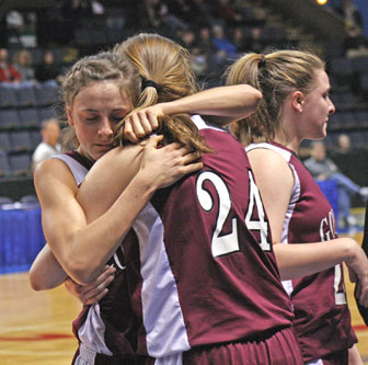 Gorham’s Mia Rapolla fights back tears as she hugs Kristin Ross during the closing seconds of the Rams’ season-ending loss to McAuley on Saturday.