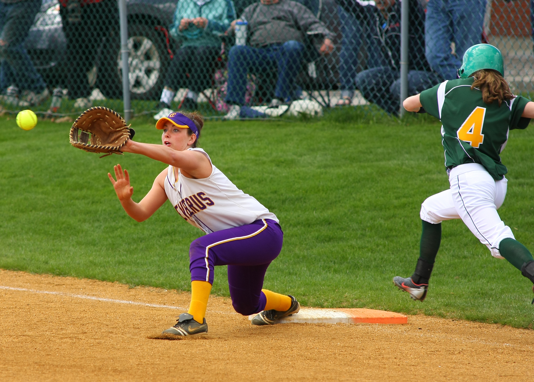Cheverus senior Lexi Hilton stretches to make the putout just before McAuley freshman Heather Chapman can reach first base.
