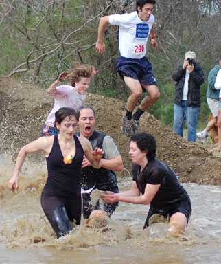 The highlight of the trek was undoubtedly the mud pit, a 10-by-20-foot pool that was filled with two feet of brown water, bordered on both ends by steep dirt inclines. Many runners approached this hazard with caution, then – seeing there was no way around it – hurled themselves bodily into the muck, splashing onlookers with waves of ooze.