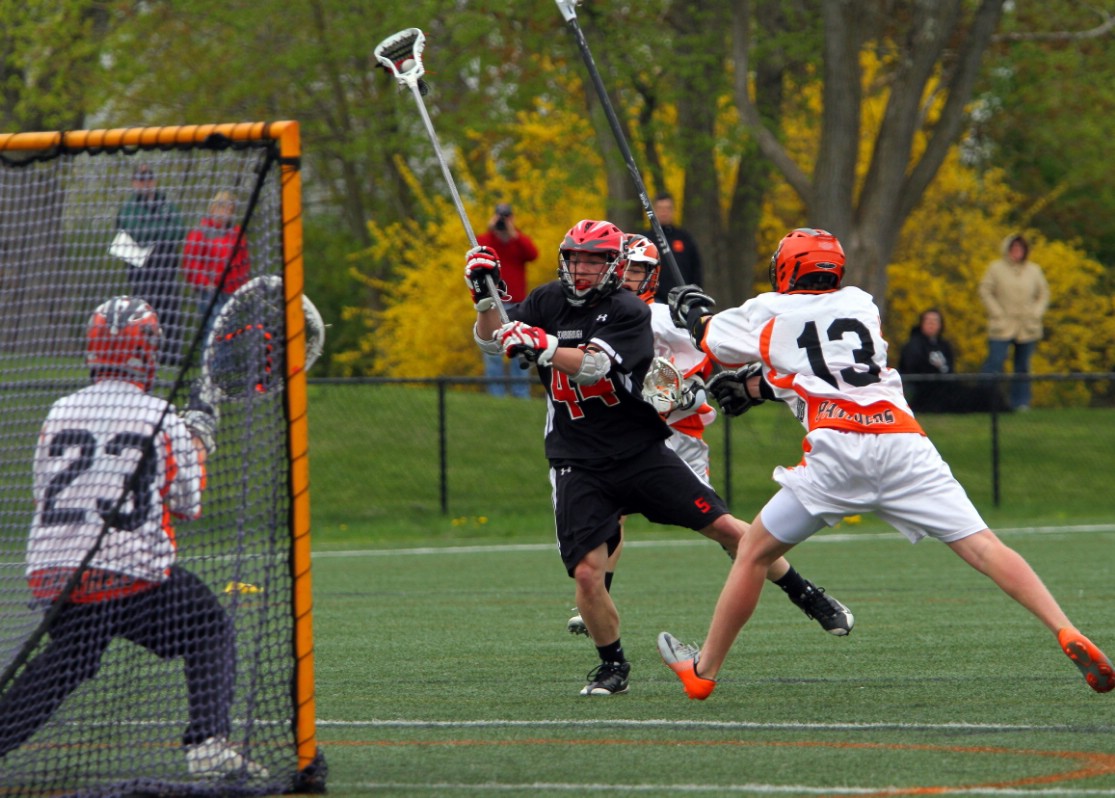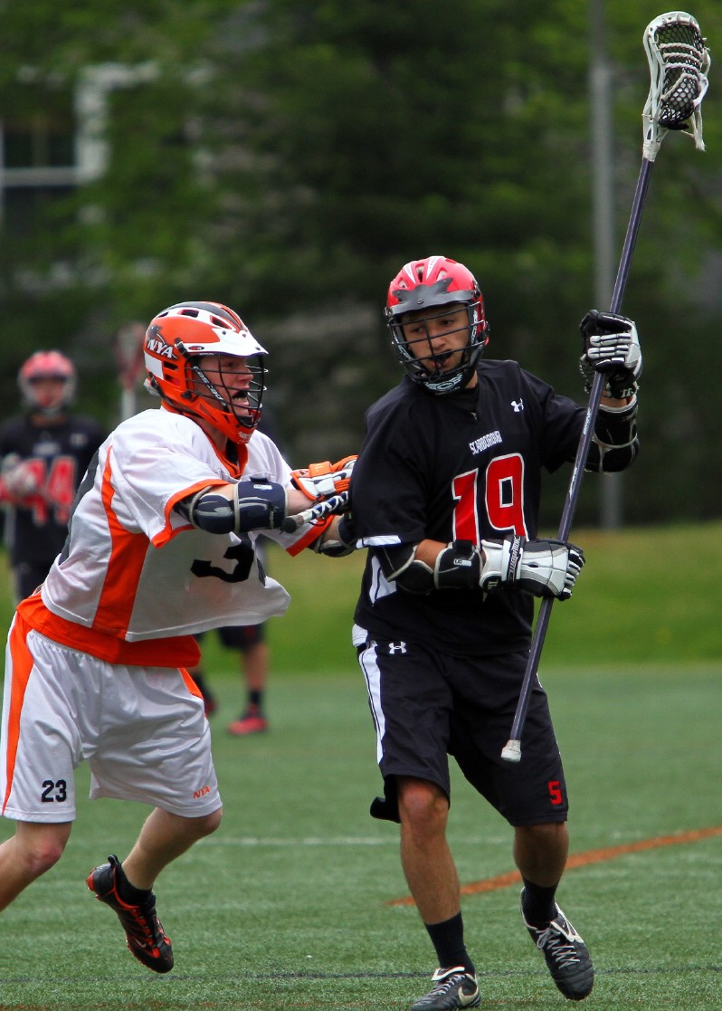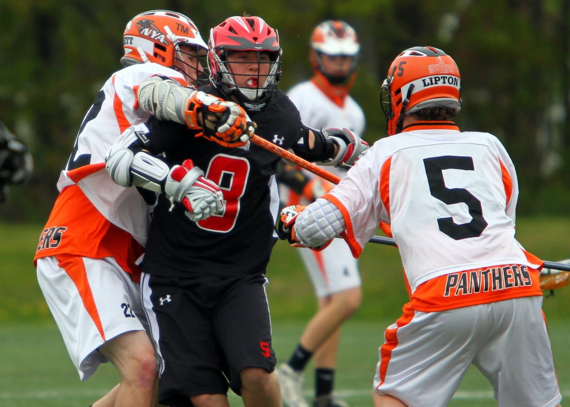 Scarborough senior Mark Pearson races into the offensive end with his long stick and fires a shot past NYA freshman Wesley Bright while Panthers freshman goalie Weston Nolan looks on. The Red Storm went on to a 12-5 victory in the crossover battle.