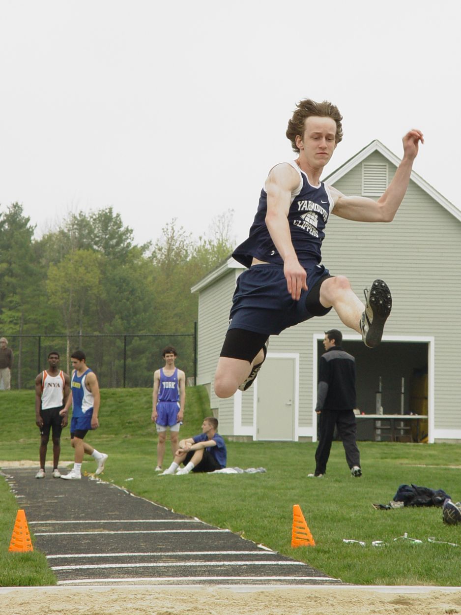 Yarmouth’s Asa Arden soars to a first place finish in the Division II long jump at Saturday’s Western Maine
