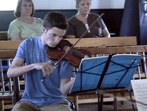 Amateur violinist Adrian Bean plays in a string quartet at last year’s Master Class workshop as part of the Maine Festival of American Music at Sabbathday Lake Shaker Village in New Gloucester. The quartet performed a spirited 1893 Dvorak composition. (Photo courtesy of NGTV)