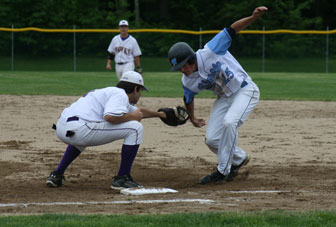 Westbrook’s Sam Stauble attempts to dive back into first base in the early innings of Westbrook’s Class A semifinal game against Marshwood on Monday, Stauble was picked off on the play, but he recovered to score a run and drive in the game-winning run in the Blazes’ 2-1 win. (Staff photos by Mike Higgins)