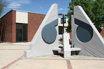 Today, the commons and its two business park buildings are home to several businesses, but they include a law firm, a credit union, a telemarketing company and an insurance underwriter’s office. They share the area with a few abandoned storefronts. Lighting is blocked by trees, and the commons’ dominant feature is a decades-old sculpture with blue symbols that represent musical notes. Metal fixtures that look like water spouts stick out of the top of it. Luke said there may have been a water fountain there once, but if so it hasn’t worked in years. Luke said the sculpture prompted the nickname “Blue Note Park,” which is a reference to the crooner Rudy Vallee, a Westbrook native.