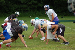 On Monday, the team was in full pads, and unlike Sunday, the weather mercifully obliged by clouding over with occasional showers. Each teammate stood wearing helmets emblazed with multiple local logos and mascots, to the point where it became difficult to distinguish what school a player hailed from.