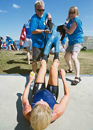 their wetsuits so they could move to the bicycle leg in Sunday’s