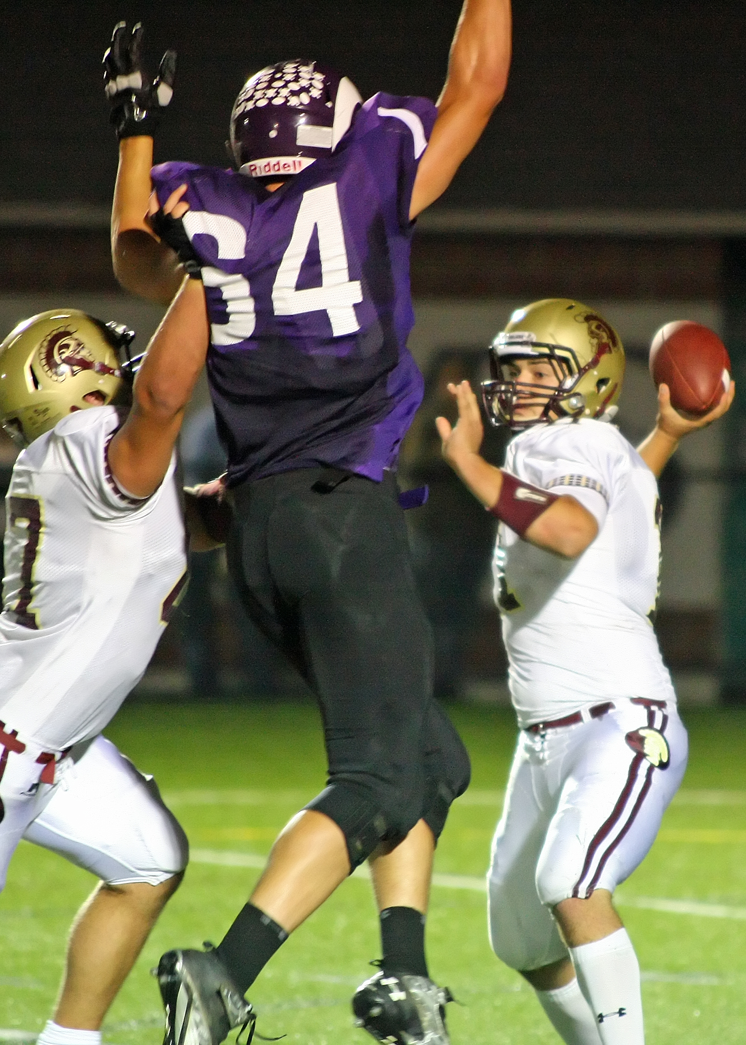 Deering senior Alex Stilphen completely obscures the passing lane for Thornton Academy quarterback Eric Christensen. The Rams fell from the ranks of the unbeaten Friday night, after a 28-21 home loss to the Golden Trojans.
