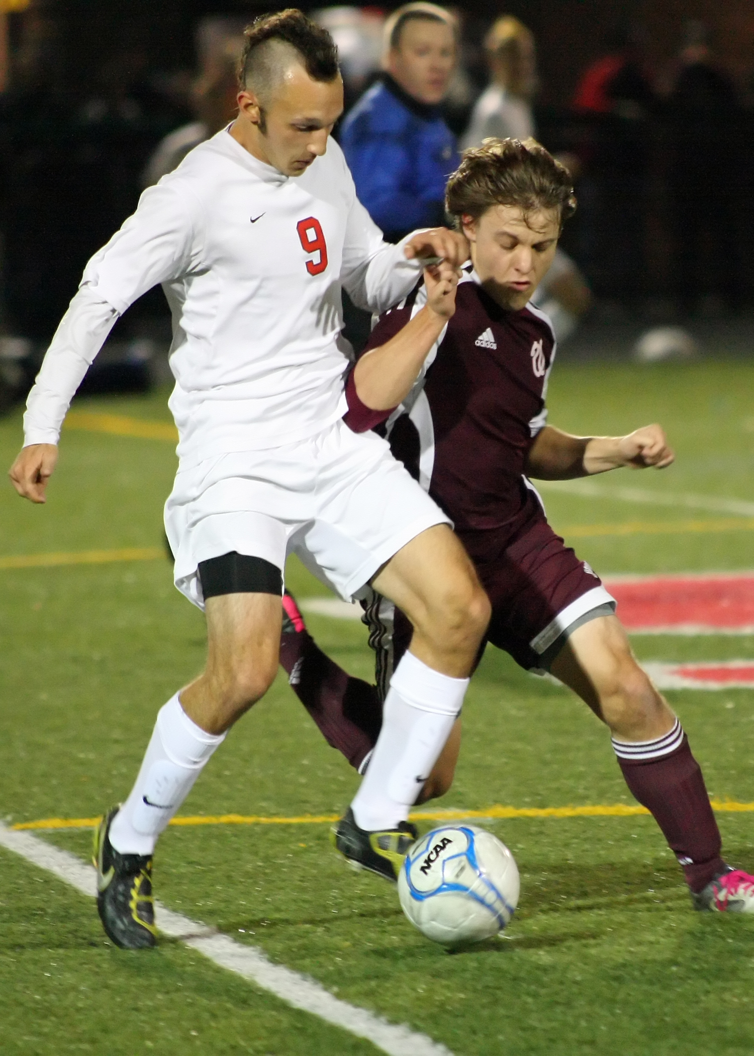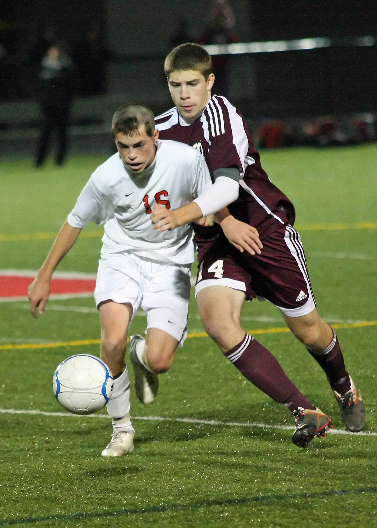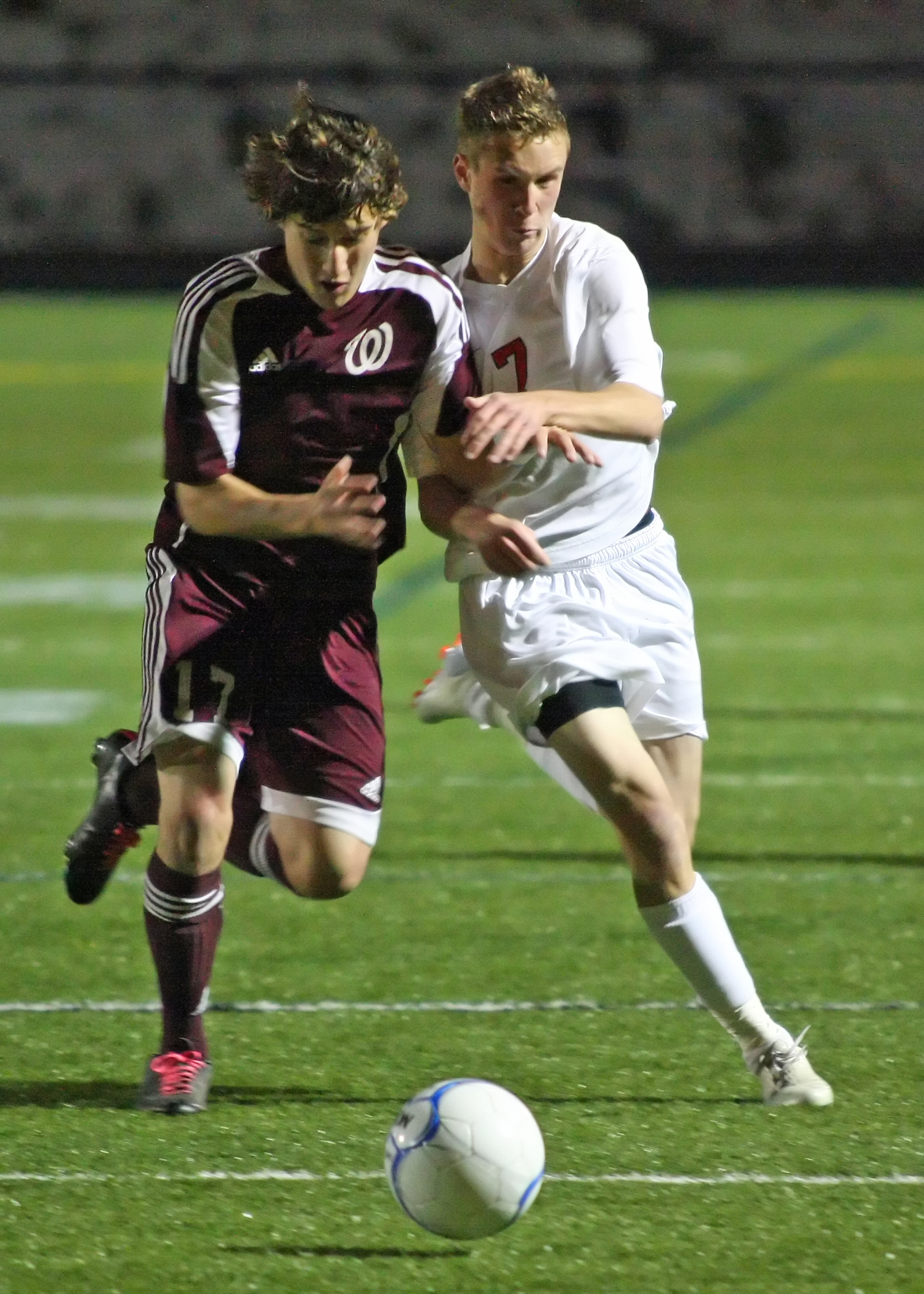 Scarborough junior Kenny Hodgdon tries to fend off Windham junior Tyler DeFosse as he chases down the ball.