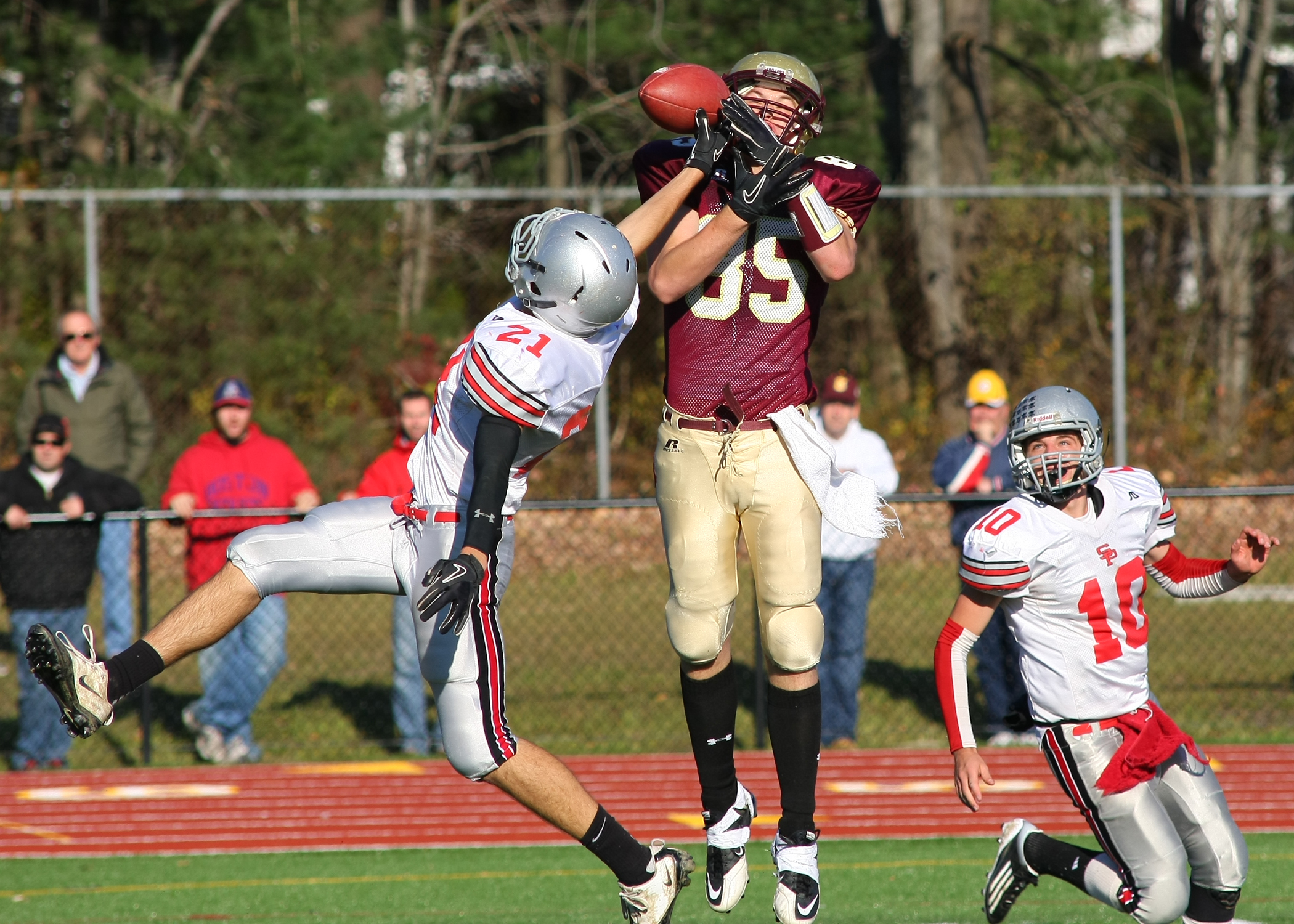 South Portland senior Logan Gaddar breaks up a pass intended for Thornton Academy junior Dakota Tarbox as senior Michael Salvatore