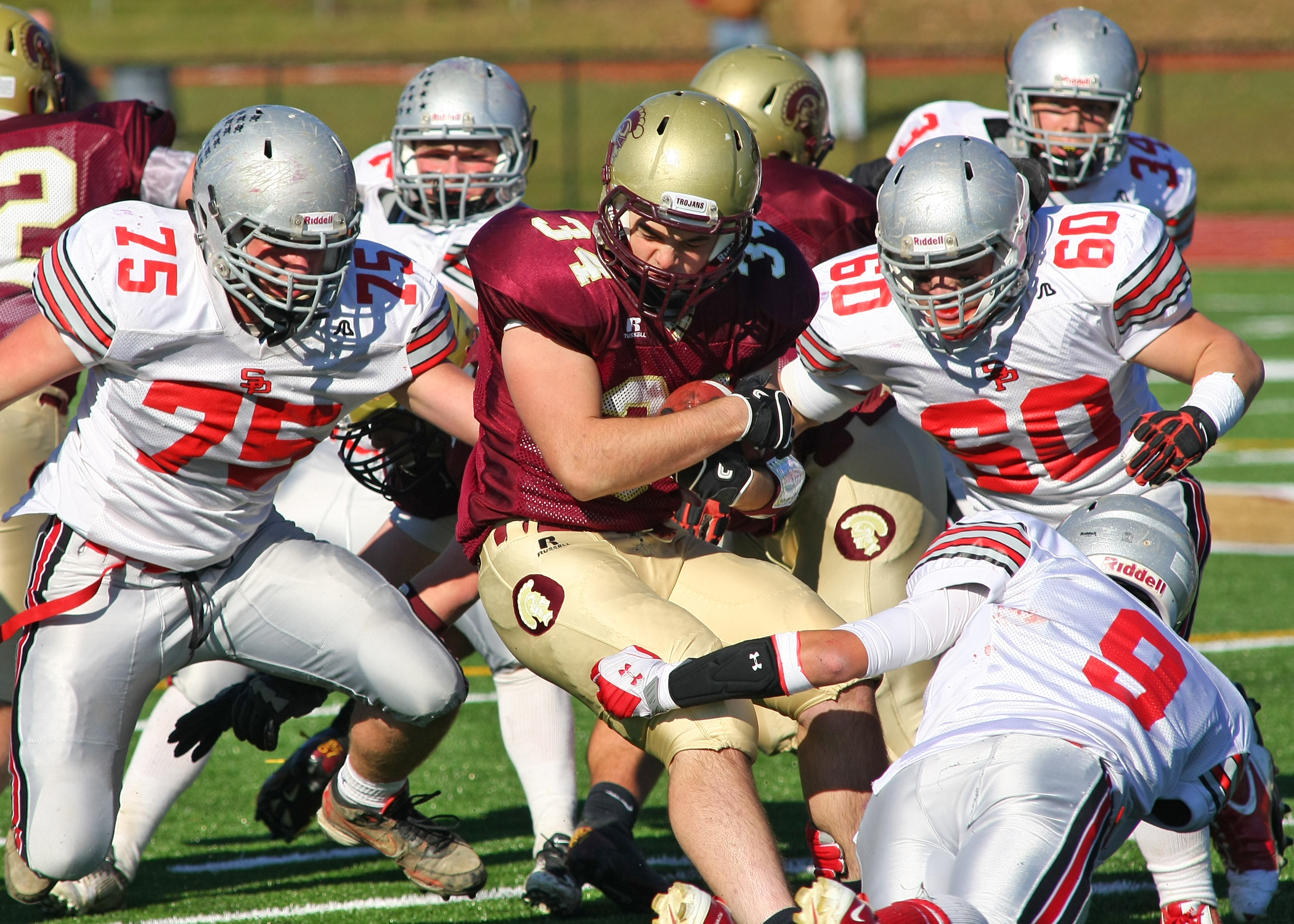 South Portland junior Liam Rottkov (75) and senior Zac Gillette get ready to bring down Thornton Academy junior Nick Kenney as senior Zach Compton wraps up Kenney’s legs.