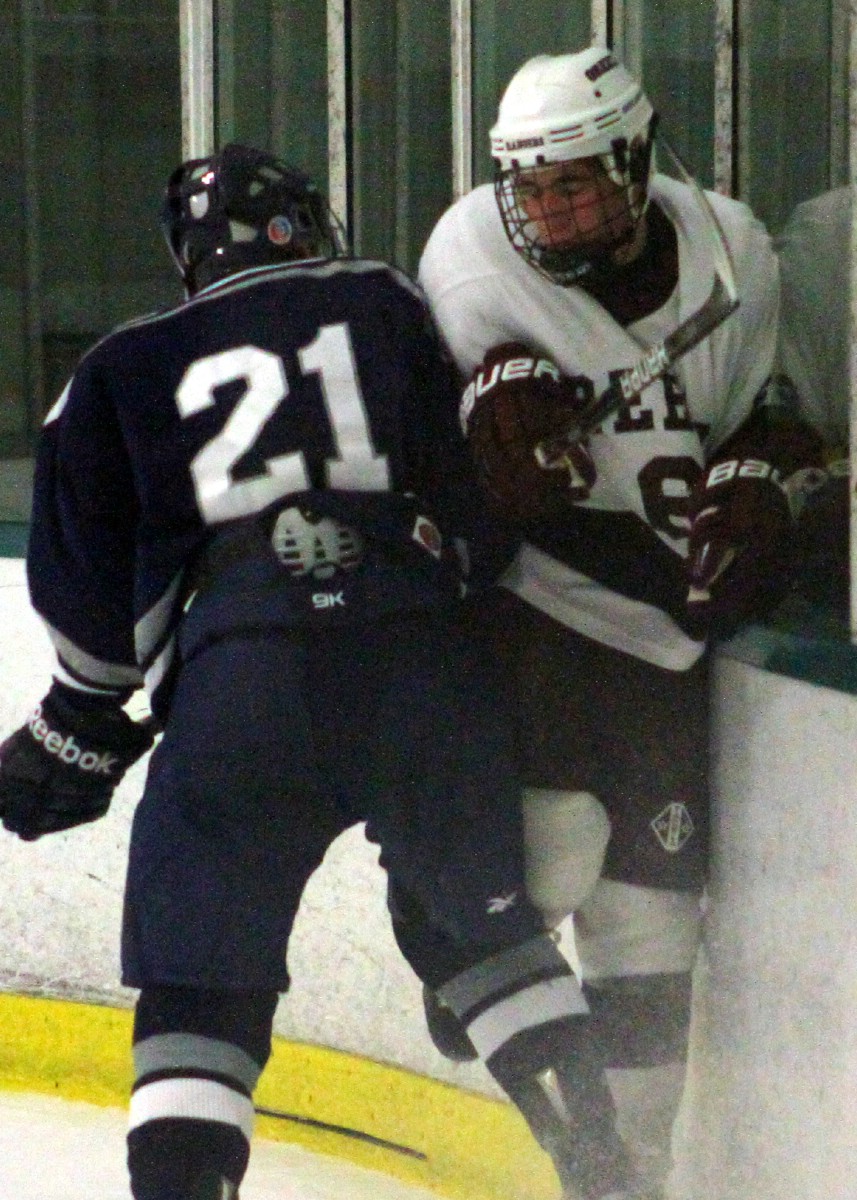 Yarmouth senior Alex Kurtz delivers a hit on Greely senior Andrew Hackett up against the boards.