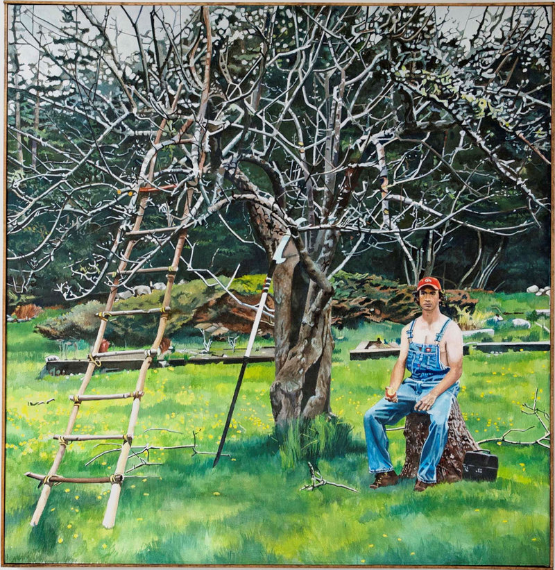 It’s a dramatic, attentive portrait of a young man on break. He is seated on a tree stump, wearing overalls and a baseball cap pulled down on his brow. His hands rest on his thighs, with a partially eaten apple in one hand. A handmade ladder stands among the tree’s tangled lower branches, and a pole pruner is propped against a limb.