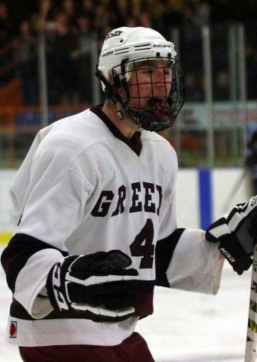 Greely sophomore Zac Doucette celebrates his power play goal which made it 3-0 Rangers.