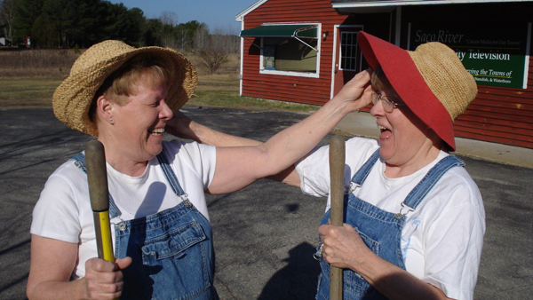 Hostesses of a televised garden show, Buxton Selectwoman Dianne Senechal, left, and her twin sister, Donna Sawyer of Limington, ham it up as they prepare for a live show this weekend to benefit charity. (Courtesy photo)