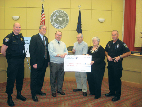 Westbrook-Gorham Triad Friday presents a $500 check for Martha’s Cottage, a home for abused elderly women. Pictured are, from left, Capt. Tom Roth of Westbrook police; Ricker Hamilton, director Office of Elder Services, Maine Department of Health and Human Services; Rick Mooers, director Adult Protective Services in Maine; David Garthe and Doris Ames, co-chairs of Triad; and Gorham Officer Ted Hatch.