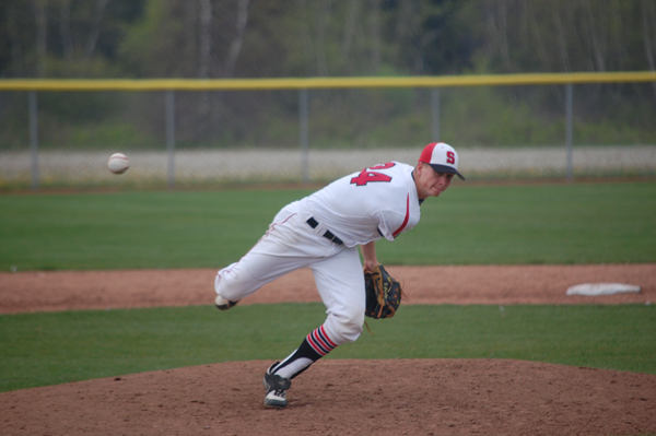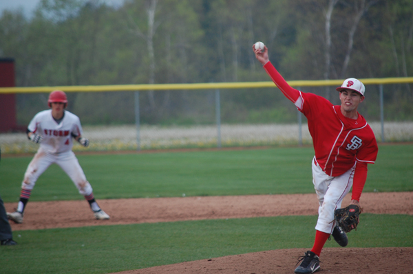 Red Riots’ pitcher Shawn Shannon delivers a pitch during his team’s 6-5 loss to the Red Storm on Monday afternoon. Shannon suffered the loss, giving up six runs in five plus innings pitched. (Staff photo by Nate Boroyan)