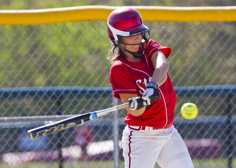 Erin Giles hits a two-out, two-run double for Scarborough. (Photos by Rich Obrey)