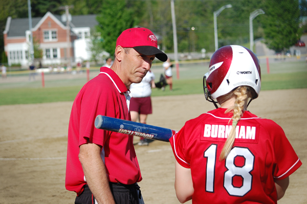 Coach Tom Griffin shares some words of advice with Burnham before she steps to the plate on Wednesday afternoon. Burnham had three hits in the game.