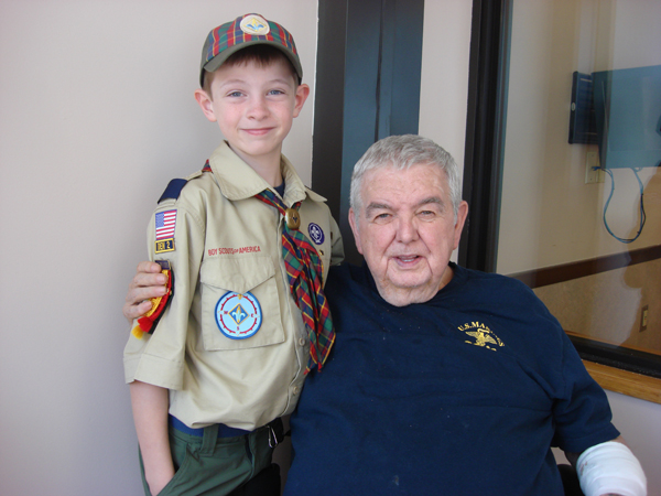 Morgan Chaput, 9, of Scarborough, still in his Scout uniform after marching in the Memorial Day parade, is pictured with his newfound friend, Bob Pratt, 77, at the Maine Veterans Home following holiday observances Monday. Chaput was recently recognized with a special citizenship award by the school district for his volunteerism, which includes weekly visits to the veterans home. (Staff photo by Duke Harrington)