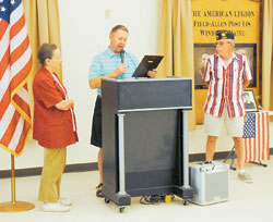Kay Soldier, a lakes Region Weekly columnist, was recognized at the American Legion Field-Allen Post 148’s open house on Memorial Day for her resolve in bringing veterans’ issues to the forefront and for her support of local veteran organizations. Presenting the award was local Legion member Brig. Gen. Don McCormack and Legion Commander Barry Lombard.