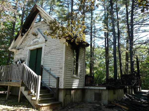 By the time the firefight was over, the roof of the church had caved in and the charred studs that had formed the walls of the small church had collapsed outward onto the ground. All that remained of the small church located in a pine grove was the front door and a wooden handicapped access ramp. The ground surrounding the building was also charred.