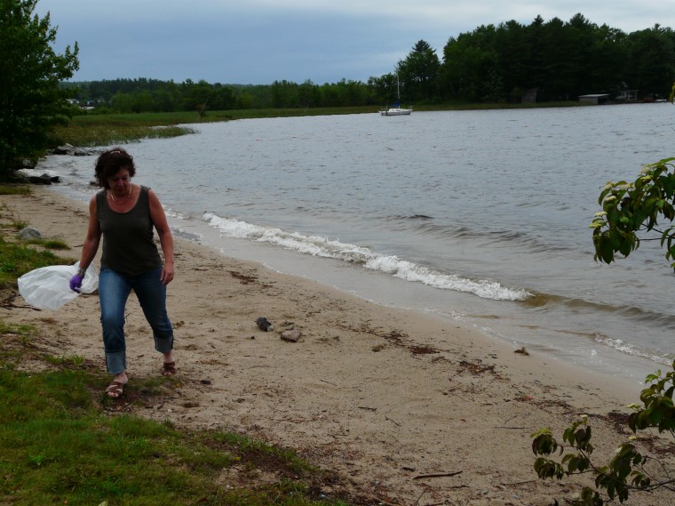 Joanne Alfiero, of Windham, walks Raymond Beach Wednesday morning looking for trash. Alfiero recently entered into an agreement with the town of Raymond to clean up the beach in exchange for exclusive vending rights. (Staff photo by John Balentine)