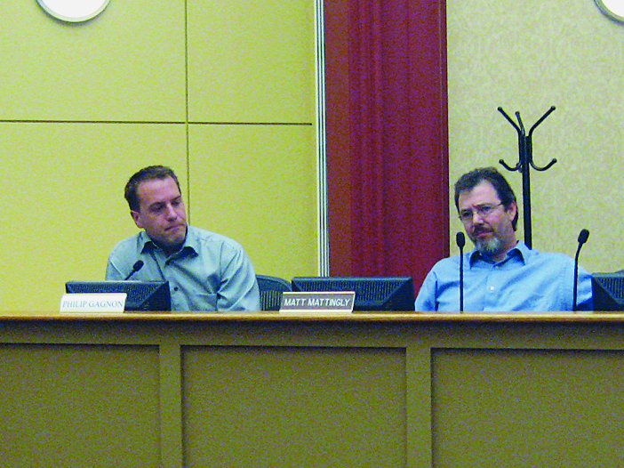Gorham Town Councilor Philip Gagnon, left, and Matt Mattingly, at a special meeting Tuesday night, are both exiting the board. (Staff photo by Robert Lowell)