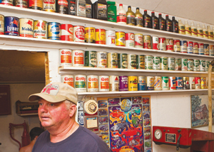 A wall of collectible oil containers, most of them still full, is part of Don Crozier’s gas station memorabilia.