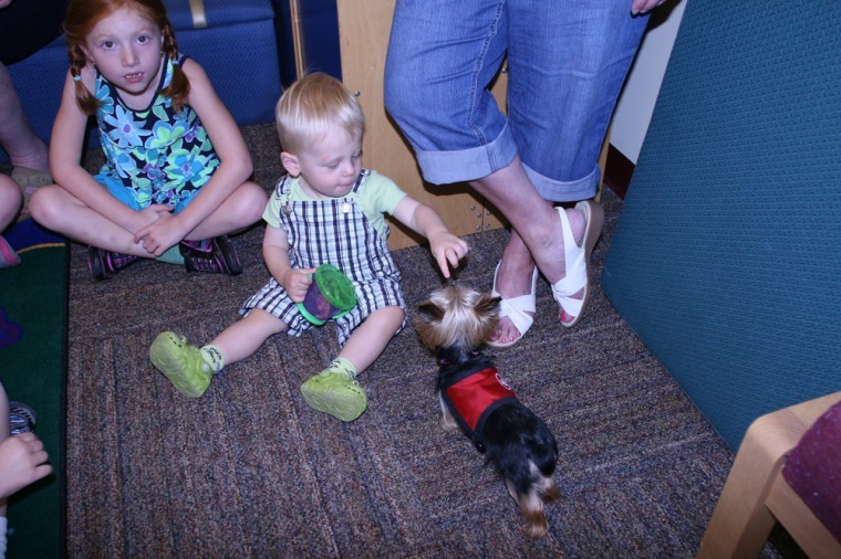 Tristan Wells, 1½, meets Lucy, a 2½ pound therapy dog during the Yorkshire terrier’s visit to Walker Memorial Library in Westbrook July 19.. Lucy, who is in the Guinness Book of World Records as the smallest working dog in the world, drew a crowd of children to the library. Staff photo by Sean Murphy