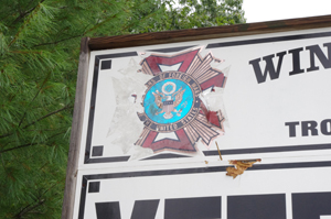 According to VFW Post 10643 member Don Swander, who noticed the vandalism on a visit to check the building July 26, the damage was limited to a chunk of wood removed from the sign and the removal of about two-thirds of a VFW decal that measures 18 inches square.